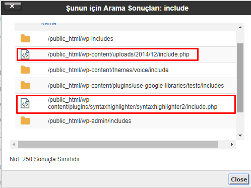 Eval’den kurtuldum sanarken bir anda yeniden ortaya çıktı. Peki ben pes ettim mi? Hayır 🙂 Öncelikle Cpanel üzerinden sitemin dosyalarının arasına daldım. Orada “include” kelimesini aradım ve bingo! 2 farklı yerde benim bilgim dışında oluşturulmuş include.php dosyaları var. Önce o dosyaları masaüstüne yedekledim ki yanlış bir şey yaparsam eski dosyayı tekrar yükleyip hatamı telafi edeyim. Sonra o dosyaları kalıcı olarak sildim ve virüs namına bir şey kalmadı. Merak edenler için benim virüslü include.php dosyalarım şu şekildeydi:
